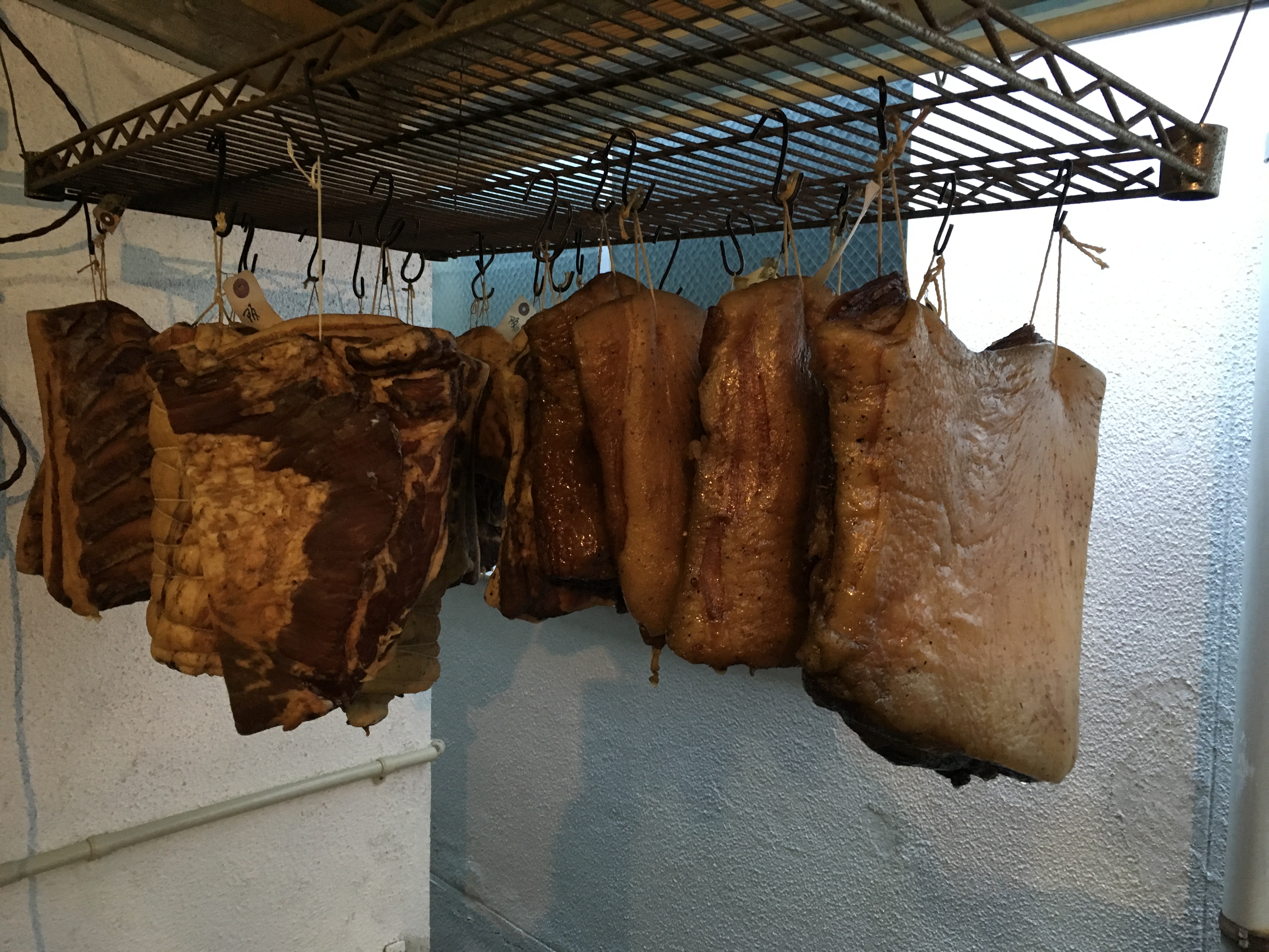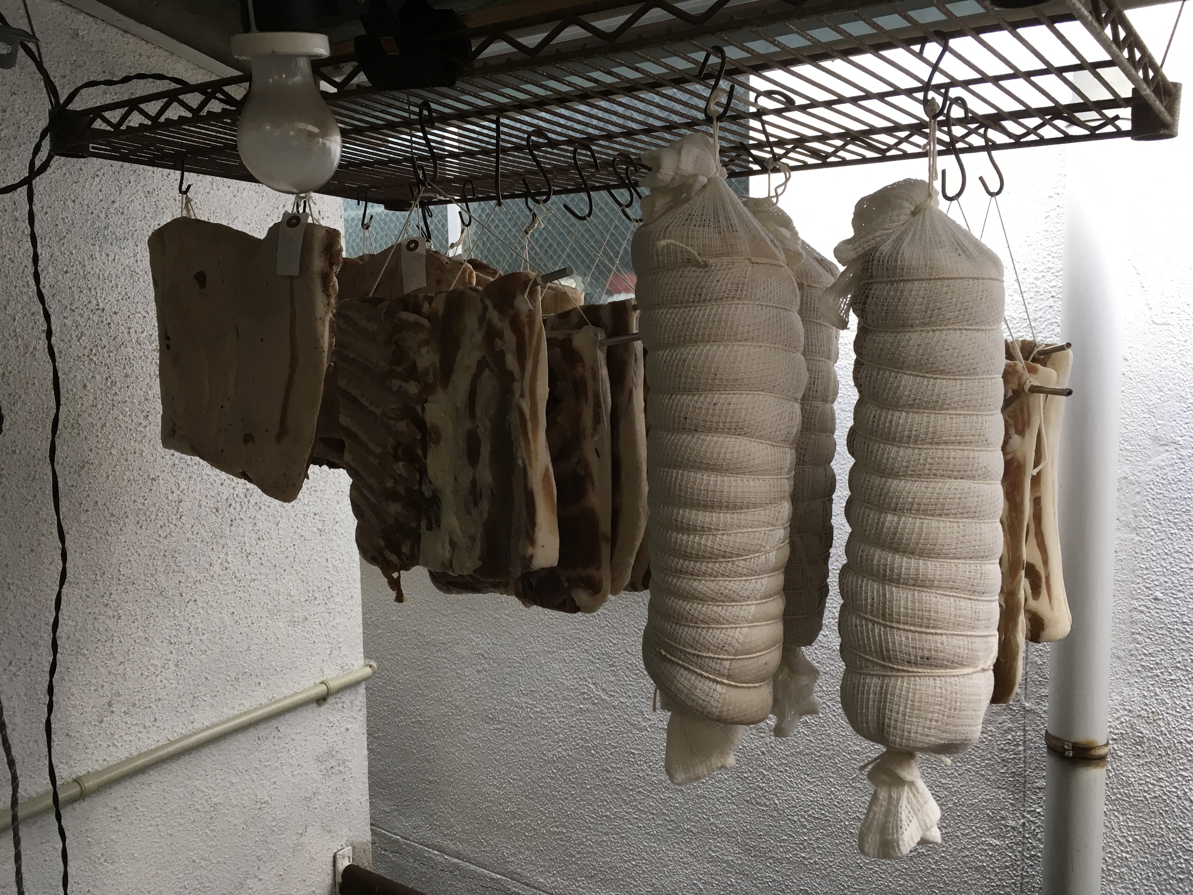 燻煙箱の空きを待つ間、しばらく風乾。手前は諸兄が作っているロースハム、ロースハムは買ってくるものと思ってたけど、意外と自分で作れるんだなあ!