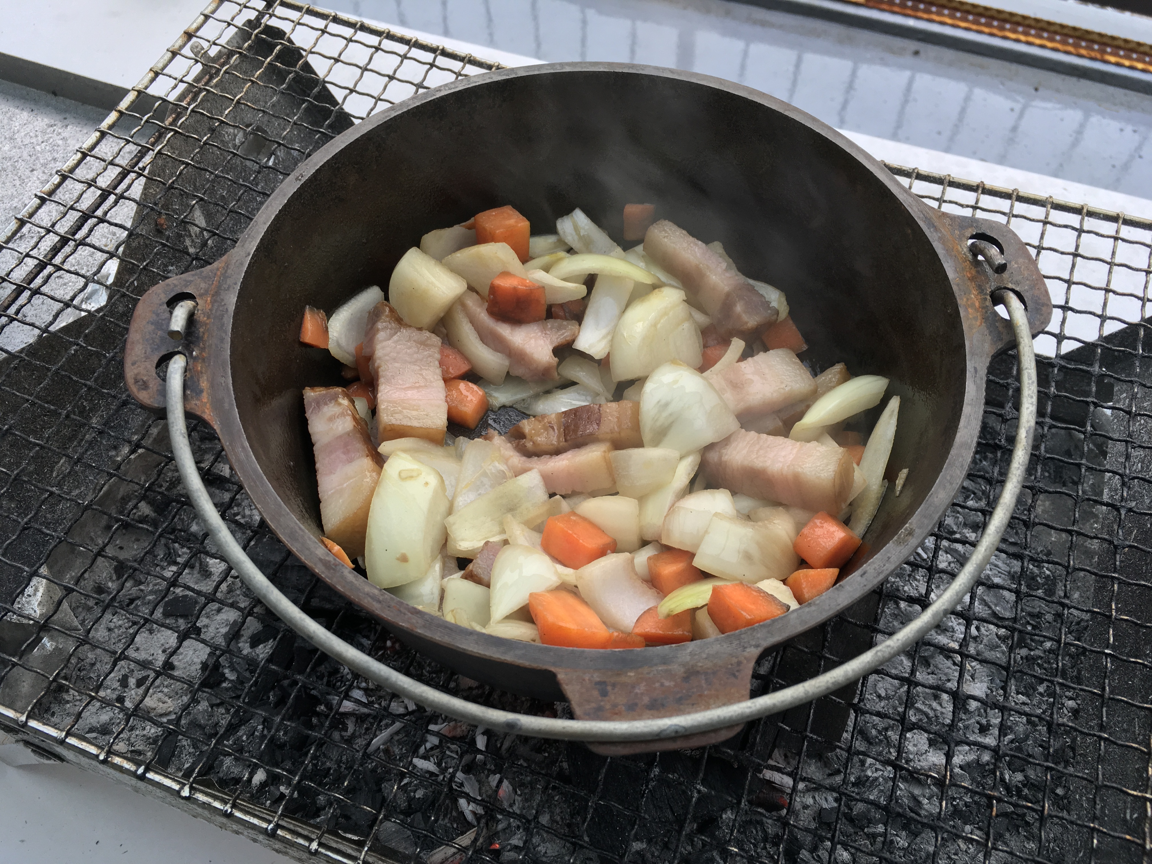 ②ダッチオーブンが温まり炭が燃えてきたら、バターを熱し、サイコロ目に切った人参を炒める