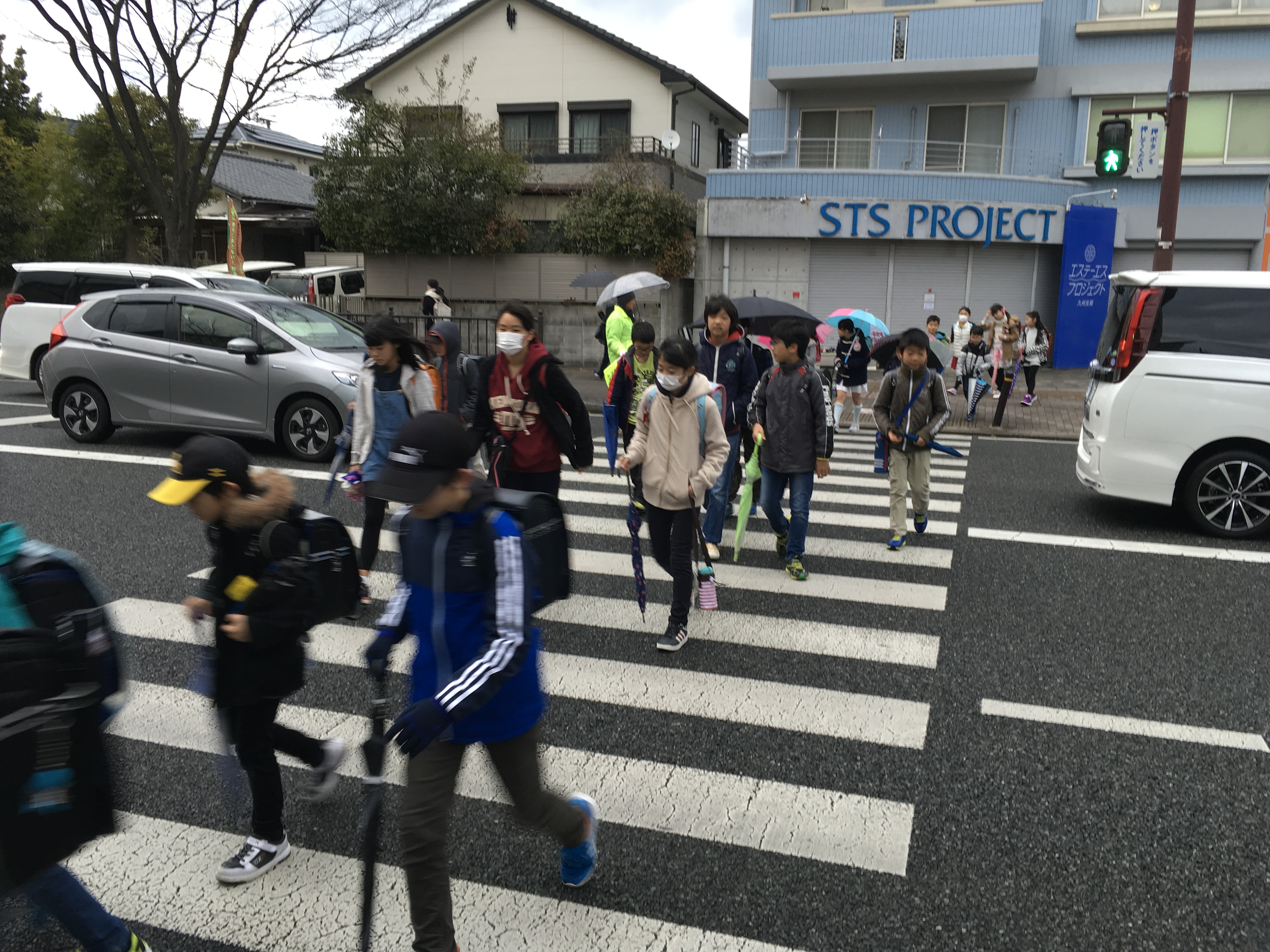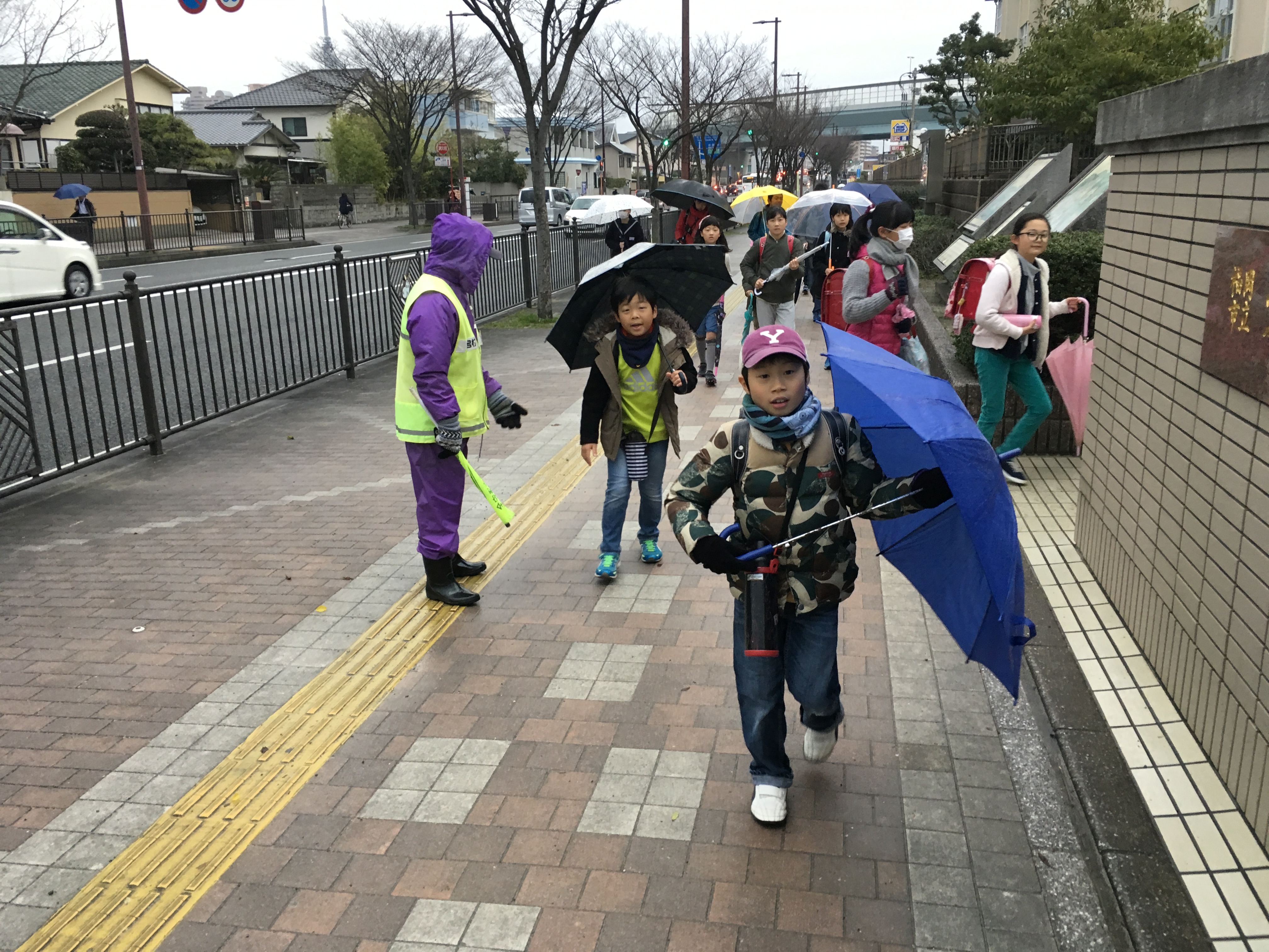 生憎の天気だったが、やっぱり15年間小学生を見守り続けているおじさんは、子供達に挨拶し、ハイタッチしてた。